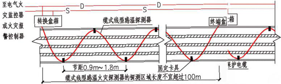 圖6.線型感溫火災(zāi)探測(cè)器在電纜接頭處敷設(shè)的示意圖